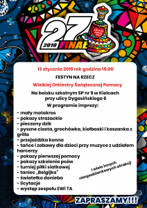 W najbliższą niedzielę, podczas 27. Finału WOŚP naszych wolontariuszy będzie można spotkać, m.in. w SP nr 9 w Kielcach. Czekają tam na Was ciekawe atrakcje 🙂